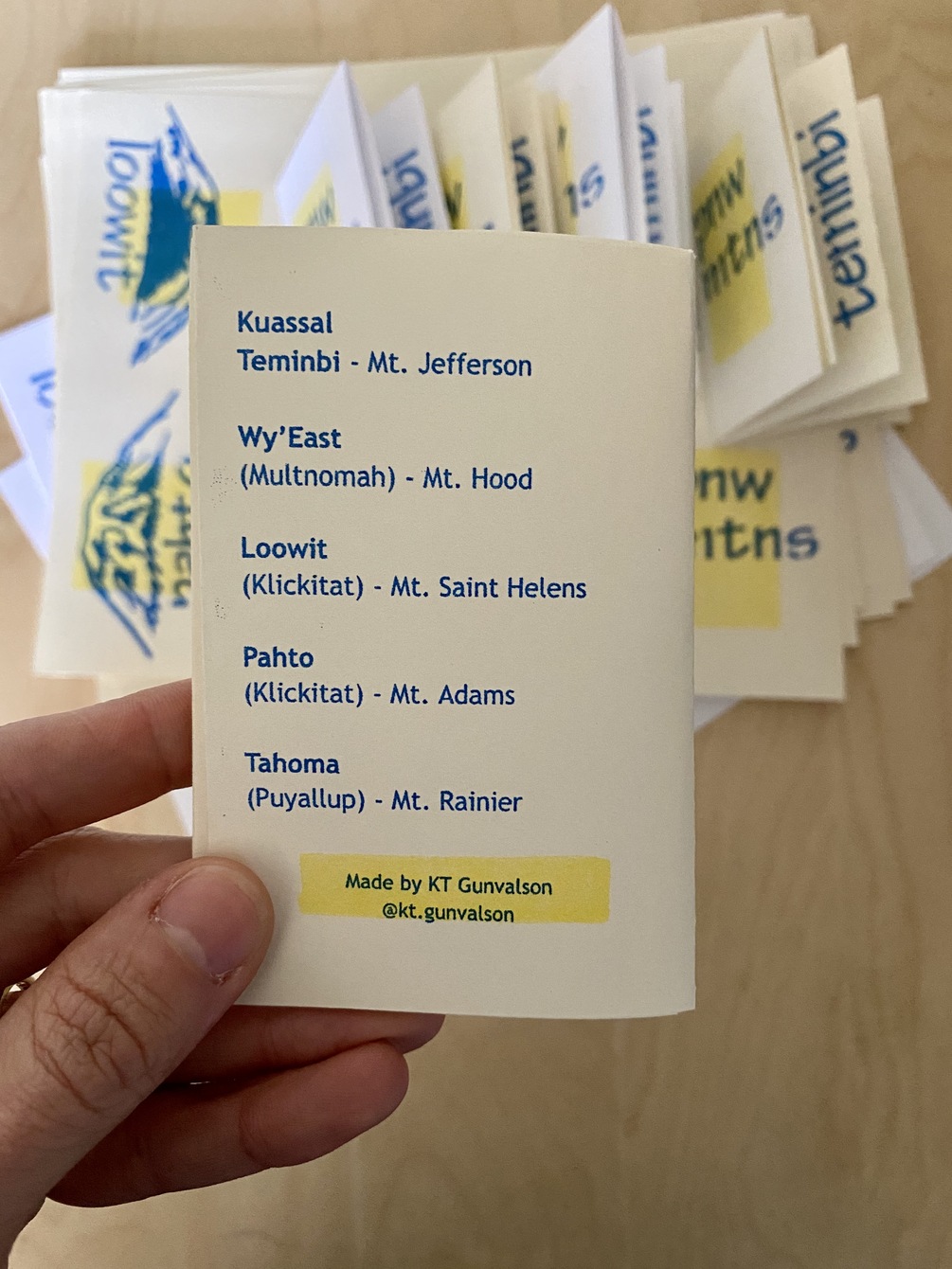 PNW MTNS is a one-sheet zine that highlights some of the known Indigenous names for mountains in the Pacific Northwest. Risograph printing by Outlet studio & print shop located in Portland, Oregon.