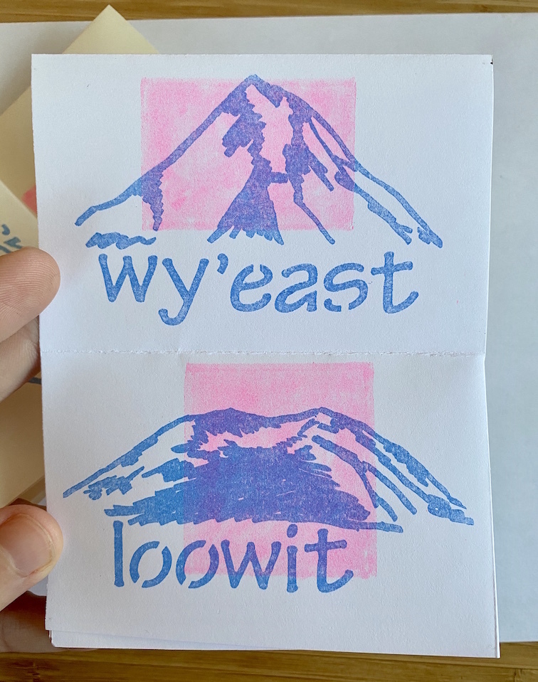 PNW MTNS is a one-sheet zine that highlights some of the known Indigenous names for mountains in the Pacific Northwest. Risograph printing by Outlet studio & print shop located in Portland, Oregon.